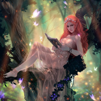 ethereal dress and is holding a book. She appears to be reading it while comfortably seated on the branch of a tree that has