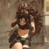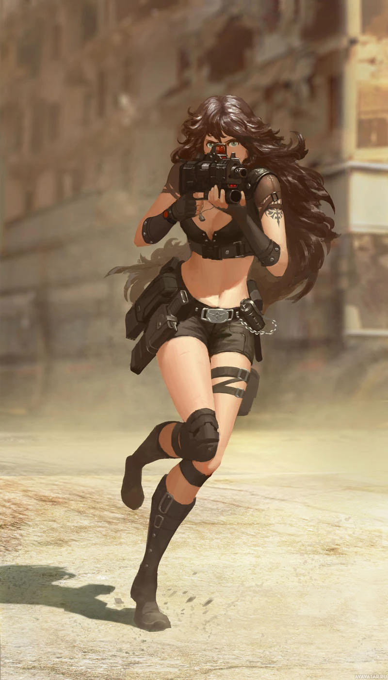 dark hair. In her right hand, she's holding a gun that suggests she might be engaged in combat or ready for action. The character is drawn in