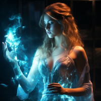 a fantasy setting. She is wearing a long, flowing dress and has her hands raised as if she is casting or controlling some sort of