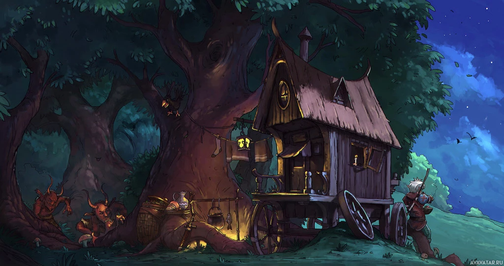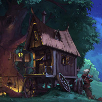 a rustic hut nestled among trees, with two characters standing outside. One character is on the left and another on the right; they are both holding staffs. In front of the hut, there's a pile of firewood, suggesting that the characters might be preparing for an evening or