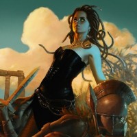 a fantasy scene featuring a character who appears to be Medusa, the mythical Gorgon from Greek mythology. She is standing in