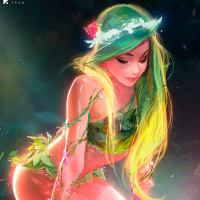 blonde hair and is adorned with green leaves that seem to be part of her body or her attire. Her expression is serene or content. The fantasy theme is suggested by the magical elements such as the green foliage and the delicate