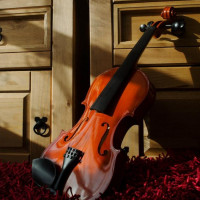 The picture shows a violin resting on top of a wooden surface, with the background featuring what appears to be wooden drawers. The light shining on the surface suggests that it might be in a room where sunlight is coming through a window or glass panes.