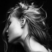 a textured garment or accessory that contrasts with the smoothness of her skin. The background is neutral and does not distract from the subject.