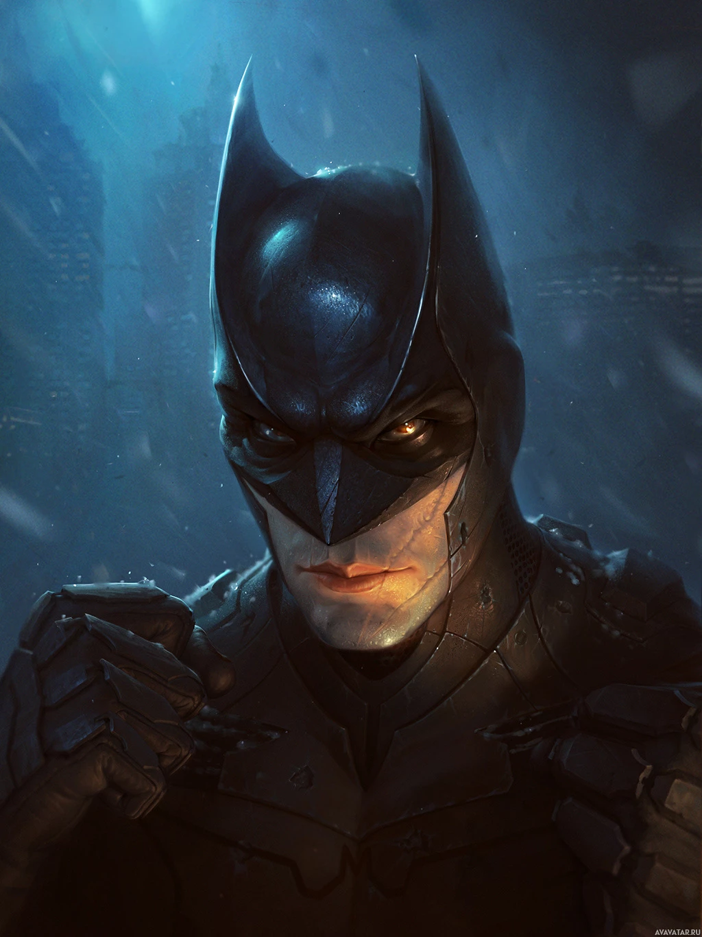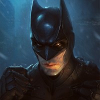 the Batman franchise. This version of Batman is depicted with a serious expression, set against a dark and moody background that suggests an urban