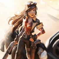 action role within her narrative. The character's expression appears to be serious or focused, adding to