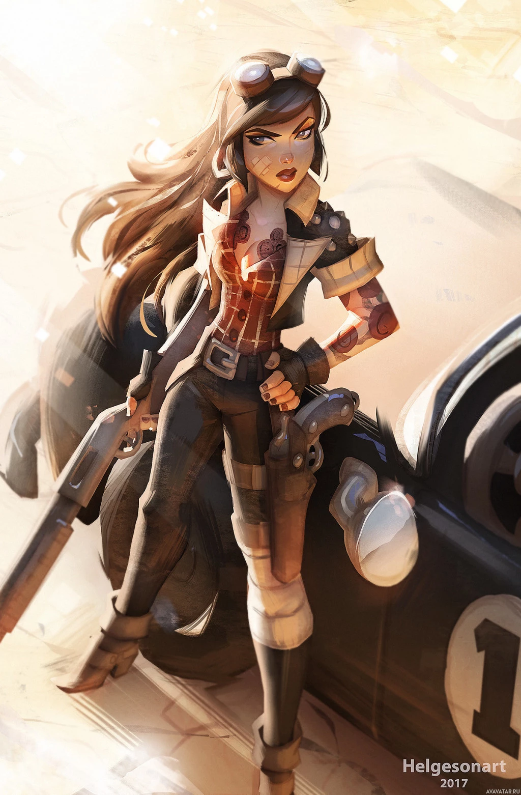 long hair, wearing a jacket and pants that seem designed for action or adventure. She is holding a weapon, which could suggest she is involved in combat or some form of