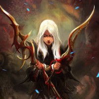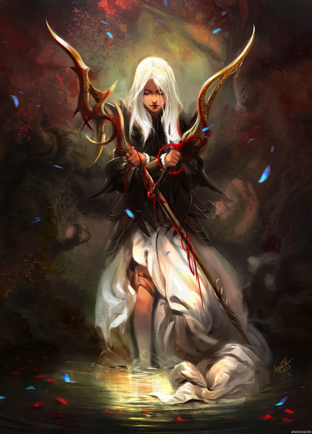white hair and is dressed in an elaborate costume that includes a black garment with golden accents, a cape, and boots. Her right arm appears to be replaced with a mechanical or fantastical prosthetic. In her left hand, she holds what seems to be a sword with
