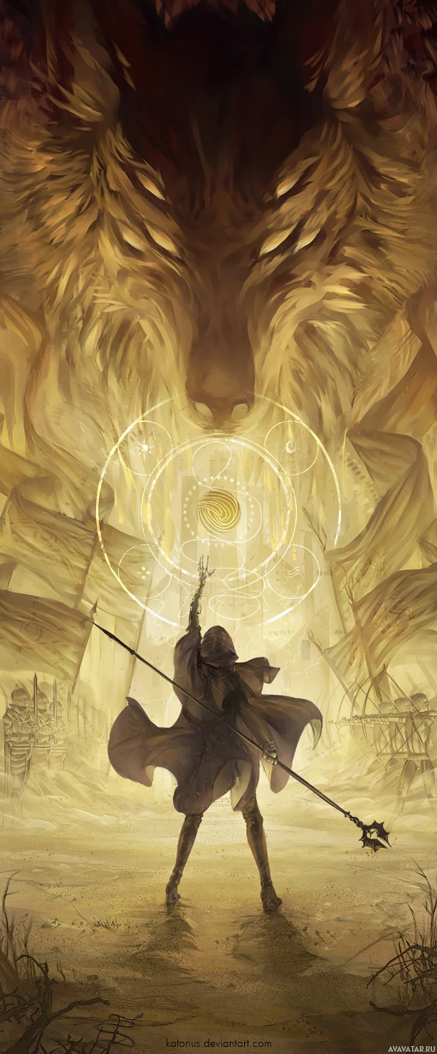 an ominous presence of large wolf figures that seem to be guarding the path forward. Above the characters is an artifact or device resembling a compass rose or a similar