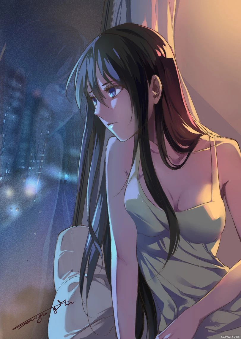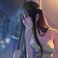 an animated character, a young girl with dark hair. She is shown looking out of the window at night, with her arms resting on