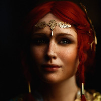 red hair styled with freckles, a headpiece adorned with what appears to be golden accents, and gold-toned accessories. They are looking directly at the camera with