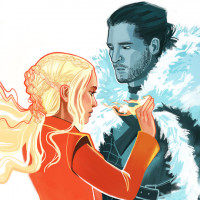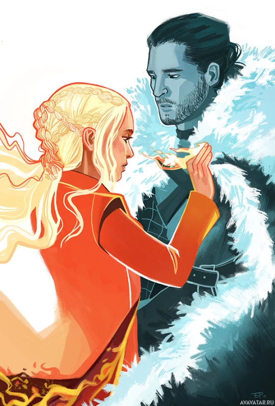 an emotional connection between them. The background seems to depict a cold, wintery landscape which is consistent with the setting of "Game of Thrones," known for its vast and diverse geographic locations.