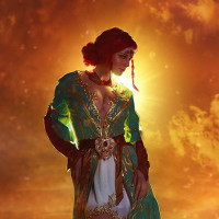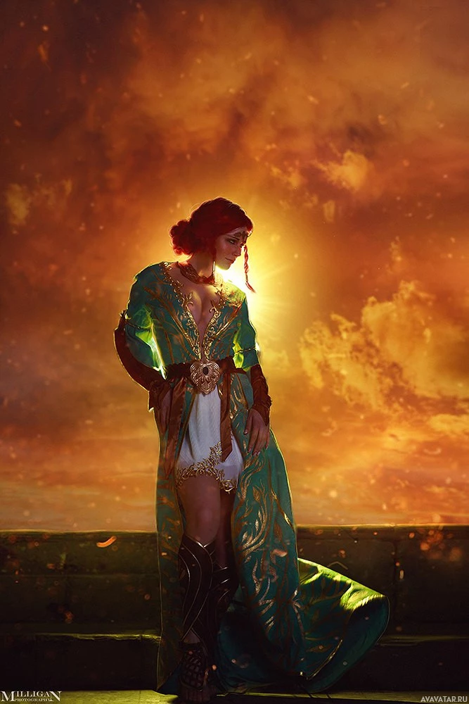 На картинке изображен персонаж из видеоигры «Ведьмак 3: Дикая Охота», известной как Трисс Меригольд. Она изображена в своей человеческой форме, одета в зеленый и золотой наряд, на фоне которого предлагается драматическая или волшебная сцена.