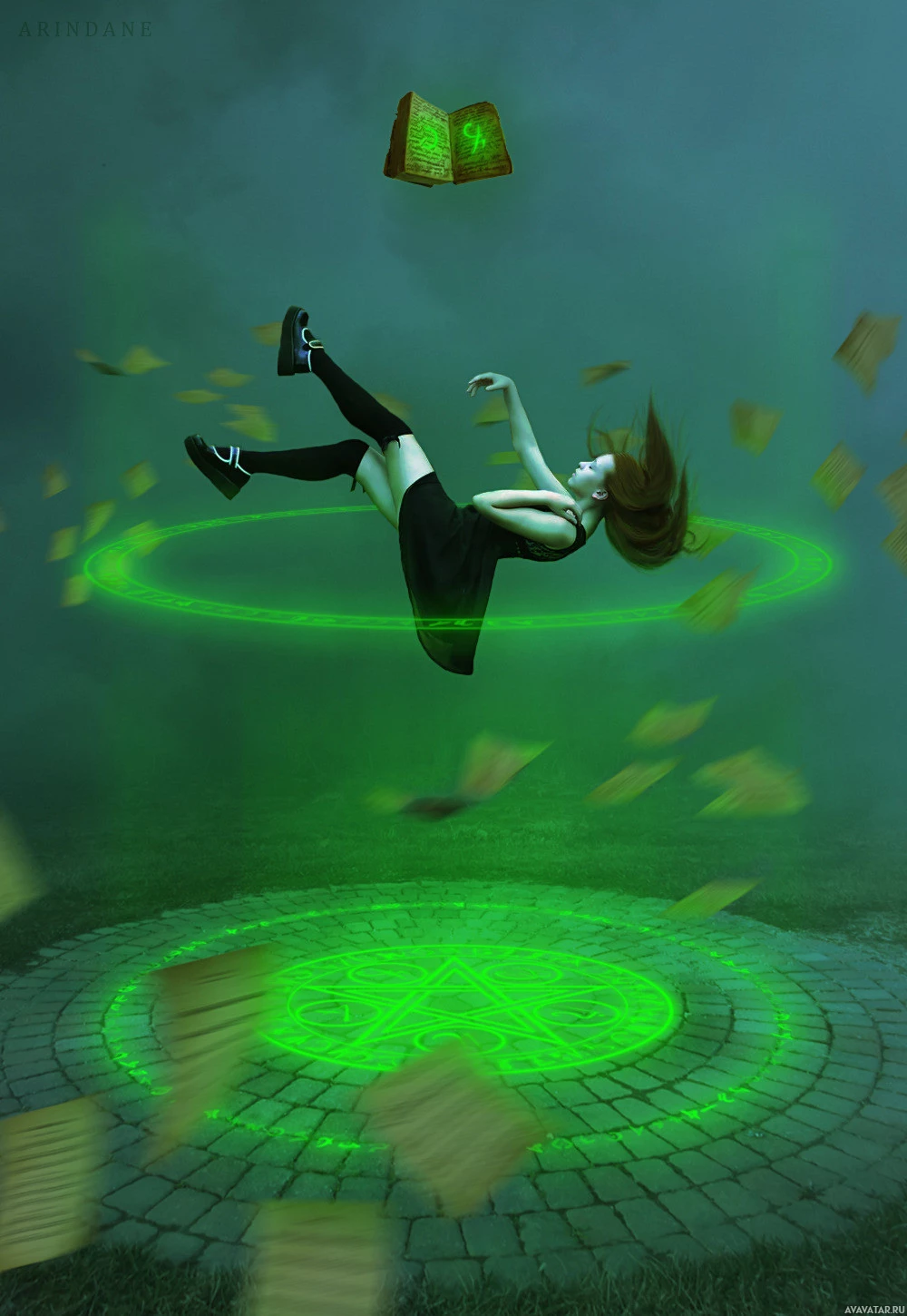 a fantastical scene where a girl is shown in mid-air, as if she is flying above a circle of glowing green books. She appears to be holding or throwing the books around her as part of this magical or mystical occurrence. The background suggests a stormy or eerie atmosphere with