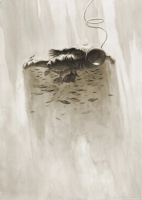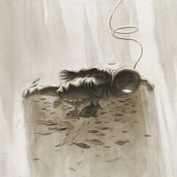 an oxygen mask around their neck, indicating that they are experiencing difficulty breathing or have been exposed to a vacuum environment without proper protection. The background suggests