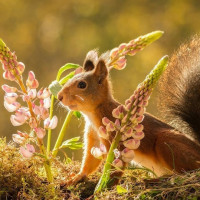 a small squirrel standing on what appears to be the ground covered with some moss and plants. In front of the squirrel, there is a cluster of