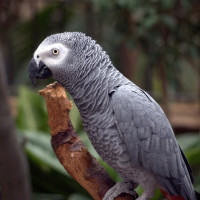 gray plumage, which is characteristic of some species of parrots. It appears to be in an enclosed environment that might be a zoo or aviary, as indicated by