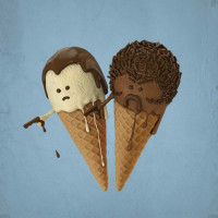 animated characters, likely meant to be humorous or whimsical, and it suggests that the two ice creams might be "arguing" or having some sort of conflict, which is often a theme in movies where characters are depicted as having opposing views or being in competition. The background is plain blue, which could imply