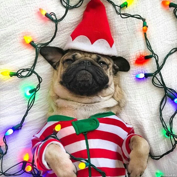 На картинке изображена собака в костюме эльфа, лежащая на кровати, украшенной рождественскими огнями. Собака отдыхает с закрытыми глазами, а общая атмосфера уютная и праздничная.