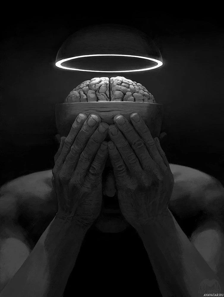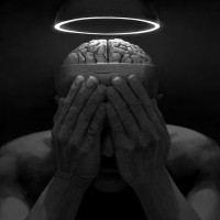 the brain area, symbolically suggesting a focus on the mind, intellect, or possibly enlightenment or inspiration. The overall mood of the image is somber and intense.