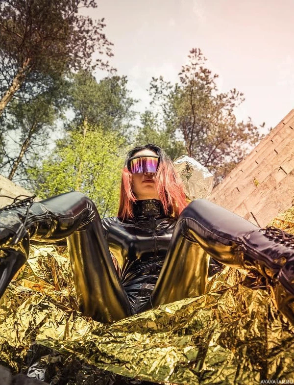 The image shows a person sitting on the ground. They are wearing a tight, shiny