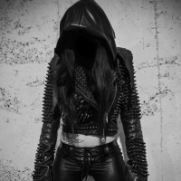 hooded jacket with spiky elements on the shoulders and chest. They are also wearing tight