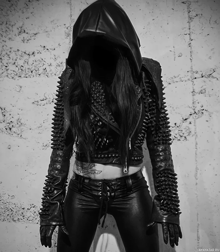 leather pants and fingerless gloves. The person is standing against what appears to be a textured or grungy backdrop, possibly a wall. The image has a stylized feel to it, suggesting that it may have been taken for
