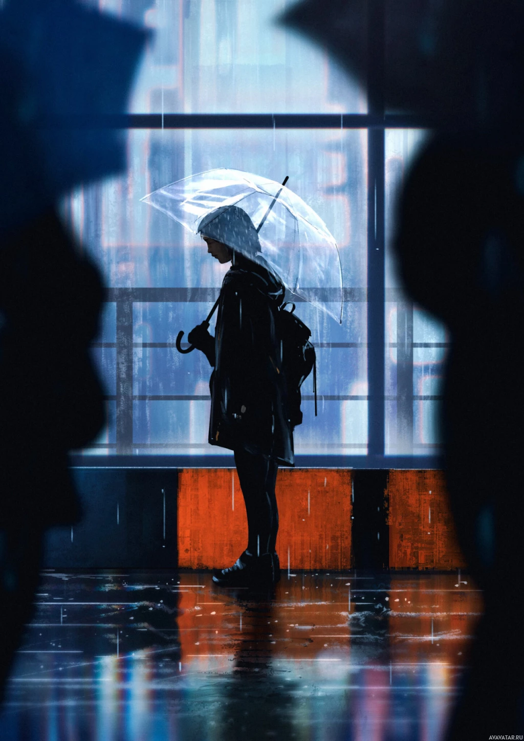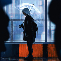 a silhouette of a girl standing under an umbrella in what appears to be a rainy or overcast weather, as indicated by the dark and wet surroundings. She's looking out through a window that reflects her image back at her. The setting could possibly be urban, given the architecture visible behind her. The art style is somewhat impressionistic with its