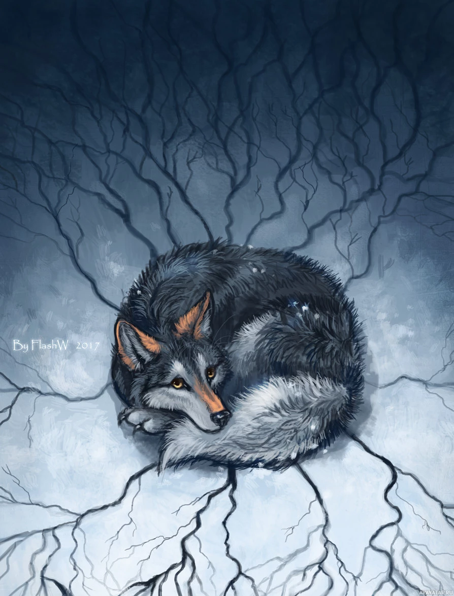 lightning bolts seemingly emanating from the wolf's head, which could be interpreted in various ways depending on the context of the image (e.g., symbolism, narrative). The overall impression is one of strength and resilience, despite the tumultuous surroundings.
