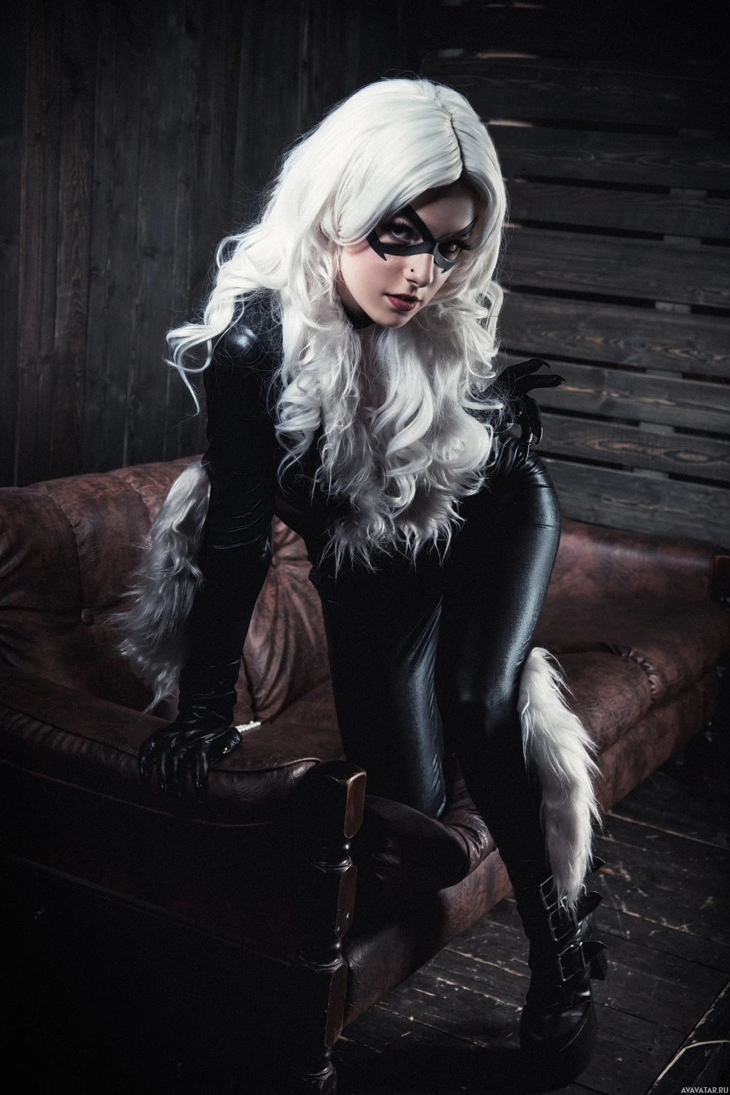 a black bodysuit with white fur accents on the arms and back, mimicking the distinctive look of Black Cat's character. The individual is sitting on a leather-covered chair with one hand resting on the armrest while looking directly at the camera with
