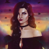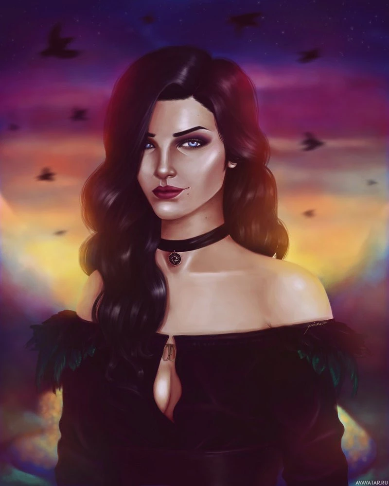 blue eyes, who appears to be dressed in a costume that resembles the attire of Yennefer from "The Witcher" series. She has