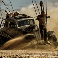 arid environment, with sand and sparse vegetation visible around the vehicle. The overall tone of the image is intense and dramatic, capturing the essence of the movie's dystopian universe where survival is at stake.