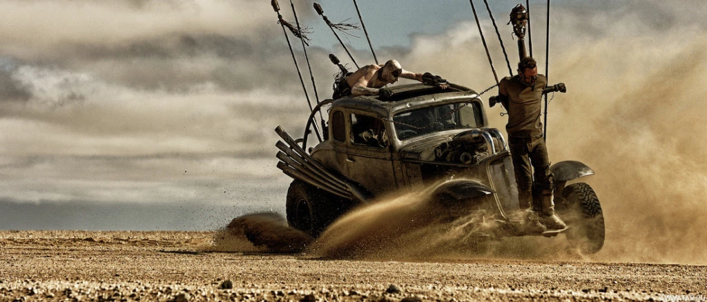 Mad Max: Fury Road." In the center of the picture, there is a heavily modified off-road vehicle known as a "Blood Car," which is part of