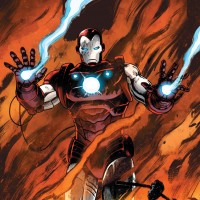 a rocky outcrop with fire in the background, suggesting he might be in an intense situation or battling some sort of adversary. The artwork is dynamic and expressive, conveying