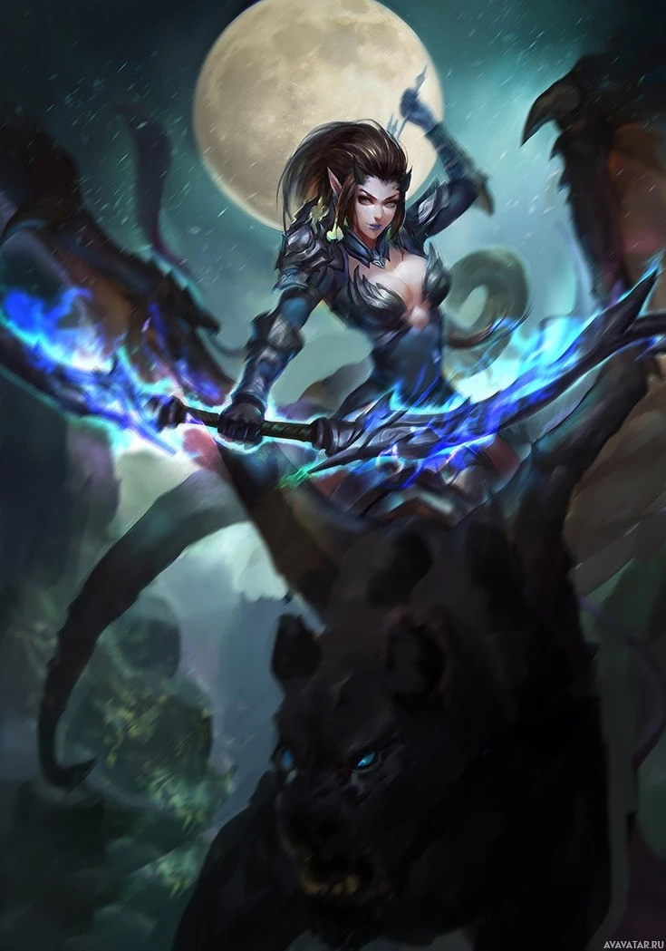 a fantasy scene with a character who appears to be a drow, which is a term often used in the context of Dungeons & Dragons to describe dark-skinned elves known for their cunning and mastery of magic. This character is shown riding on the back of a large,