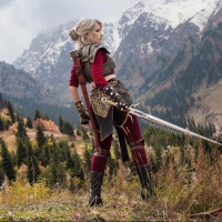 historical setting. She is standing in what looks like a mountainous terrain, suggesting an outdoor