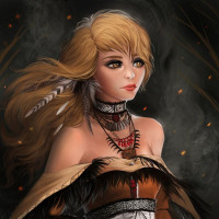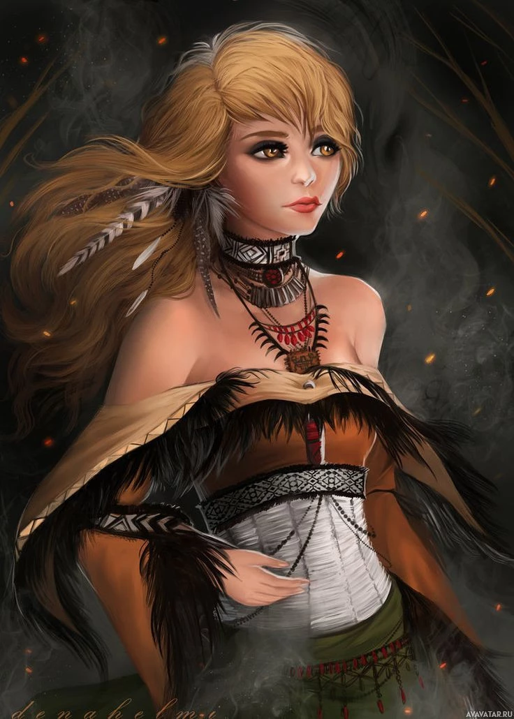 blonde hair, is wearing tribal-style clothing that suggests she might be inspired by a historical or fantasy setting, and there are feathers adorning her attire. Her expression seems contemplative or focused, with a subtle hint of defiance in her gaze. The background has an eerie,