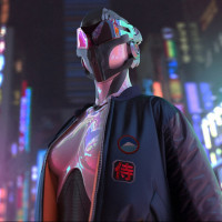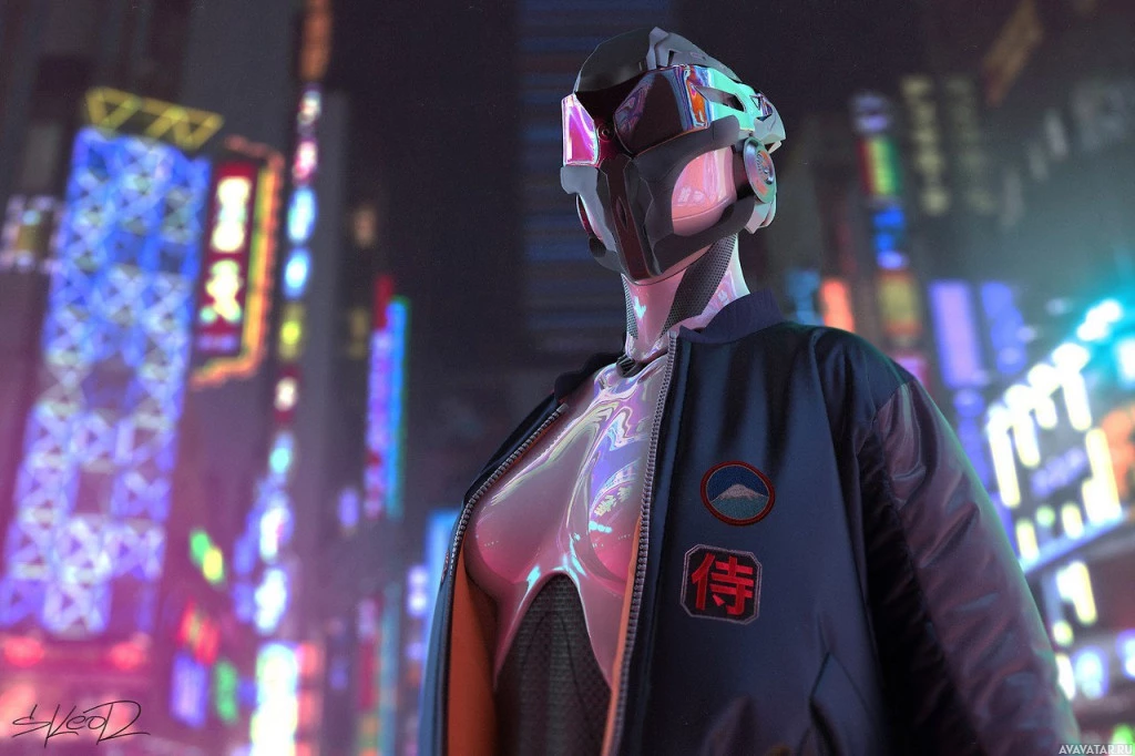 advanced technology themes. The background shows neon signs and bright lights that are typical of nighttime city scenes, enhancing
