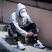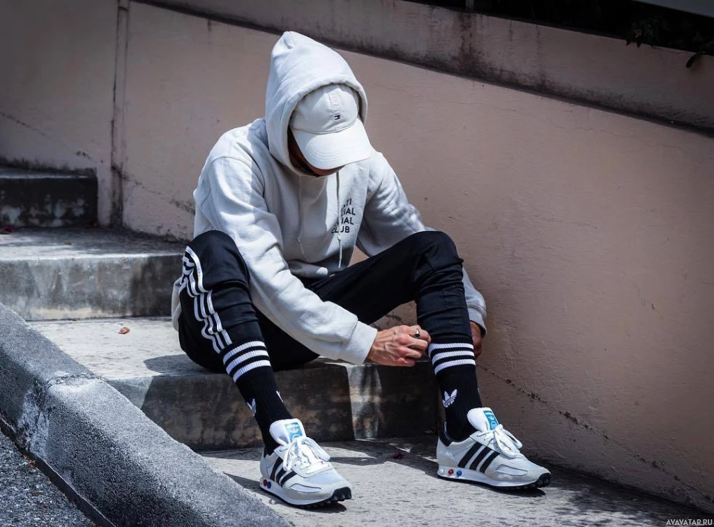 a hooded sweatshirt, joggers with white stripes down the side, and sneakers that appear to be Adidas brand. They have their legs crossed and are leaning against one of the steps they're sitting on, possibly resting or taking a break. The setting suggests