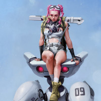 a female character with pink hair, who appears to be sitting or squatting on the back of a robot. She is wearing some sort of