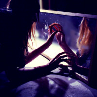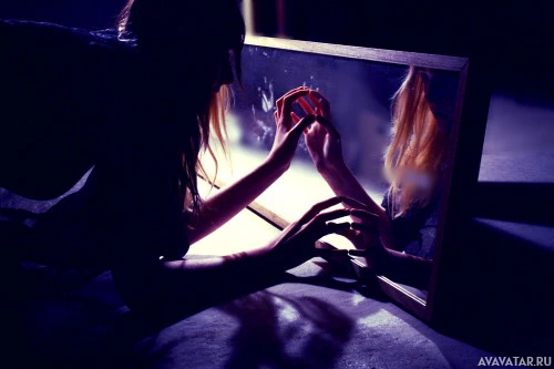 own reflection while holding something small near the bottom of the frame. The lighting is low, giving the scene an intimate or contemplative atmosphere. There's also another person visible in the mirror's reflection, but their face is obscured by the woman's hand and the object she is holding.