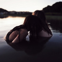 На снимке изображены два человека в воде. Это, по-видимому, водоем, возможно, озеро или пруд, во время которого может быть либо рассвет, либо сумерки, учитывая освещение и тени. Один человек смотрит в сторону от камеры, а другой слегка поворачивается к зрителю, но все еще в основном скрыт спиной человека. Атмосфера кажется спокойной и интимной.