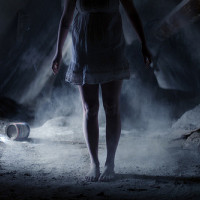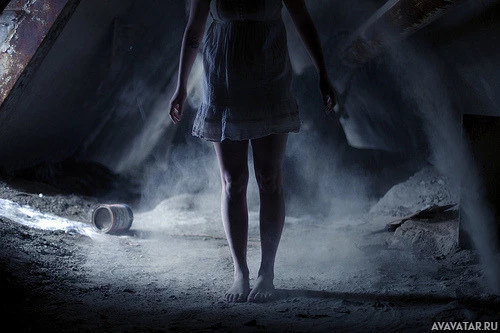 the center of a room that appears to be abandoned or under distress. She is facing away from the camera, looking down at her