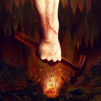 The image depicts a scene of destruction, possibly from a game. A character's hand is shown holding what appears to be a hammer that has smashed through the ground, revealing lava beneath. In the background, there is a forest with trees on fire, suggesting a chaotic or apocalyptic event. The artwork conveys a strong sense of action and conflict.