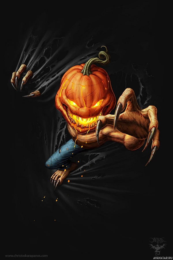 a humanoid figure with the body of a man and the head of a jack-o'-lantern, which is a common symbol associated with Halloween. The character has wide eyes and a wide grin, showing