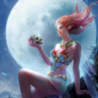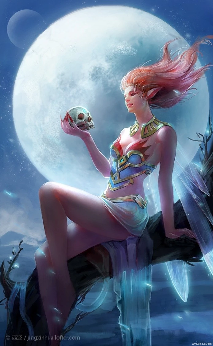 a full moon casting its glow over the scene. The elf appears to be seated on a branch or stump that is protruding from