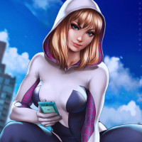 Gwen Stacy, known from comic books and various media as Spider-Woman. She is shown in a stylized illustration with her distinctive hoodie and costume elements, crouched on