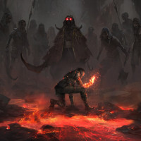 a fantasy scene with several figures. In the foreground, there is a person on their knees holding what appears to be a flaming torch or ember-filled
