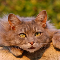 The picture shows a grey cat with its front paws resting on a surface, possibly a ledge or fence post. It appears to be looking directly at the camera with one eye open, giving it an alert or curious expression.