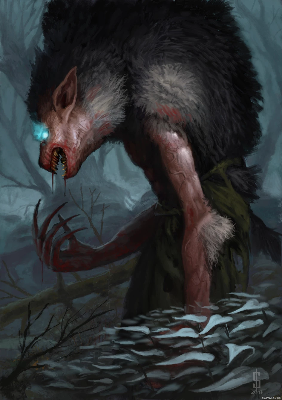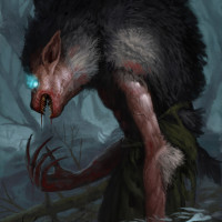 sharp teeth and claws, standing on its hind legs, and appears to be looking down at something on the ground with an intense expression. There are elements of foliage around it, suggesting that it's within a wooded area, possibly during the night given